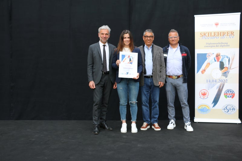 Anche la medaglia olimpica Nadia Delago (2. da sx) premiata con il diploma di maestro di sci. Nella foto insieme all'assessore Schuler (primo da sx), Zorzi e Martin Corradini, direttore tecnico dello sci alpino. (Foto: ASP/Noemi Prinoth)